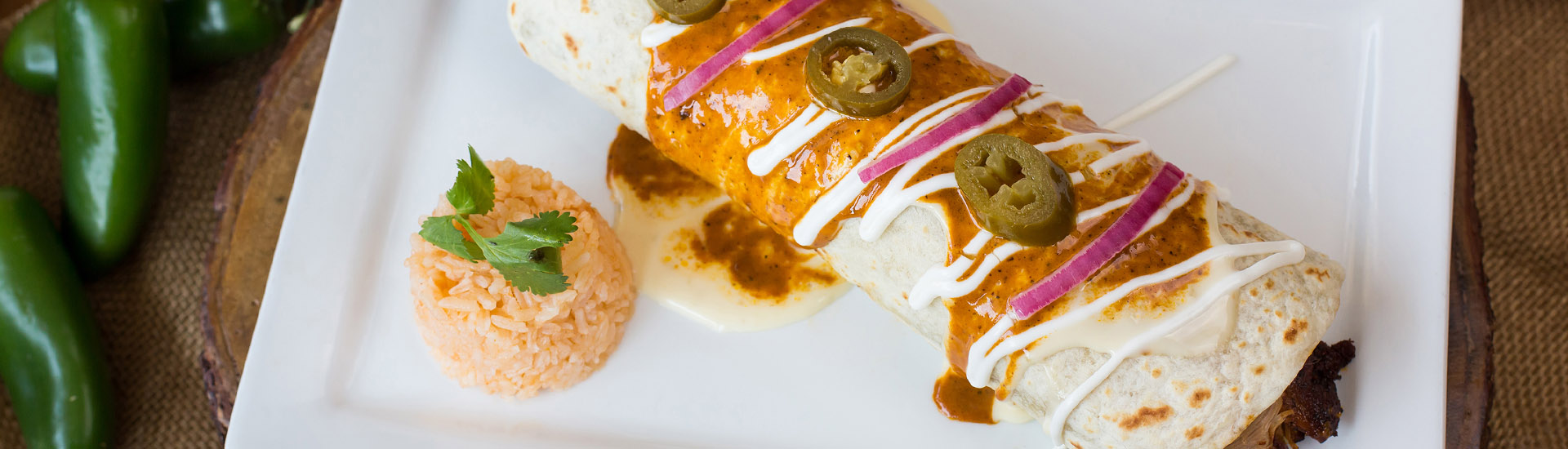 Matt burrito 16.99 Grilled chicken, steak, shrimp, chorizo, pineapple, broccoli and jalapeños. All wrapped in a tortilla, topped with cheese sauce and our special sauce. Buckeye burrito 14.99 Thinly sliced chicken meat, onion poblano peppers. Drizzled with cheese sauce and sour cream served with rice. Golden burrito 16.99 Grilled chicken, steak and shrimp covered in a rich golden sauce and sour cream drizzled with rice. Burrito chipotle 15.99 Flour tortilla filled with grilled chicken and onions, covered with a creamy chipotle sauce. Drizzled with sour cream and topped with pico de gallo. Served with rice. Burrito cochinita 15.99 A flour tortilla filled with cochinita pibil (Mexican slow-roasted pork marinated in citrus juice and annatto) covered in our special meat and cheese sauce. Drizzled with sour cream, served with rice.