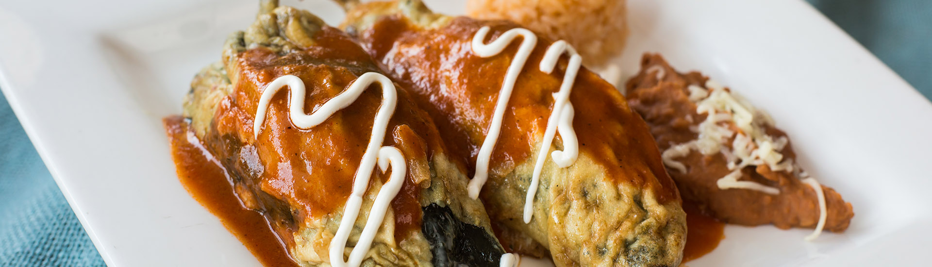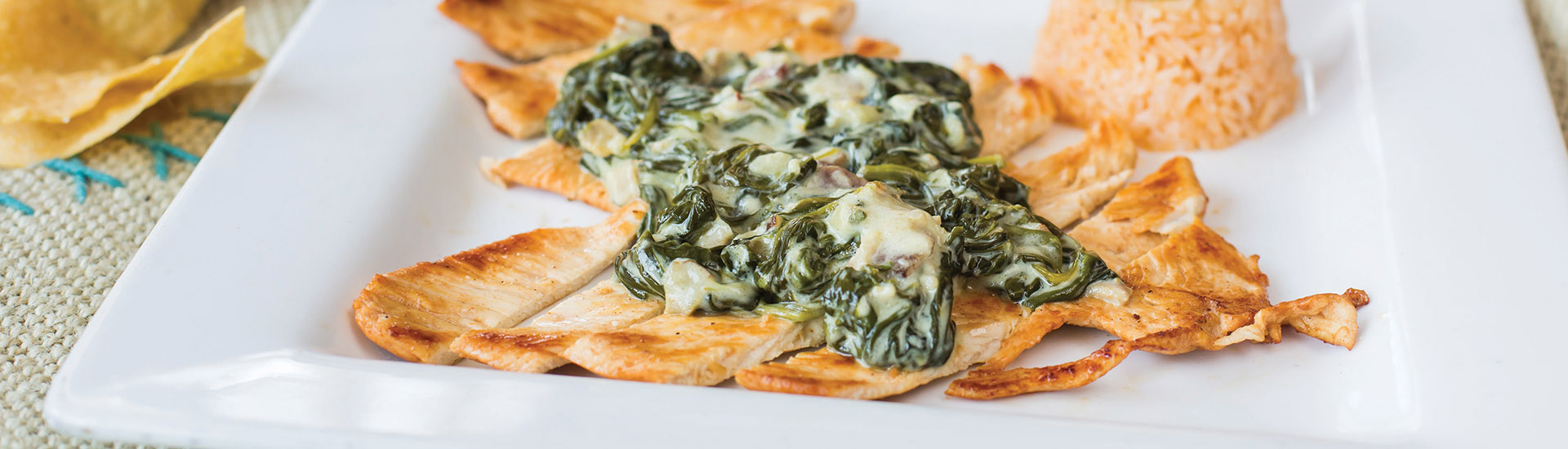 Three corn tortillas stuffed with grilled chicken and spinach. Topped with our delicious roasted poblano sauce, served with rice.