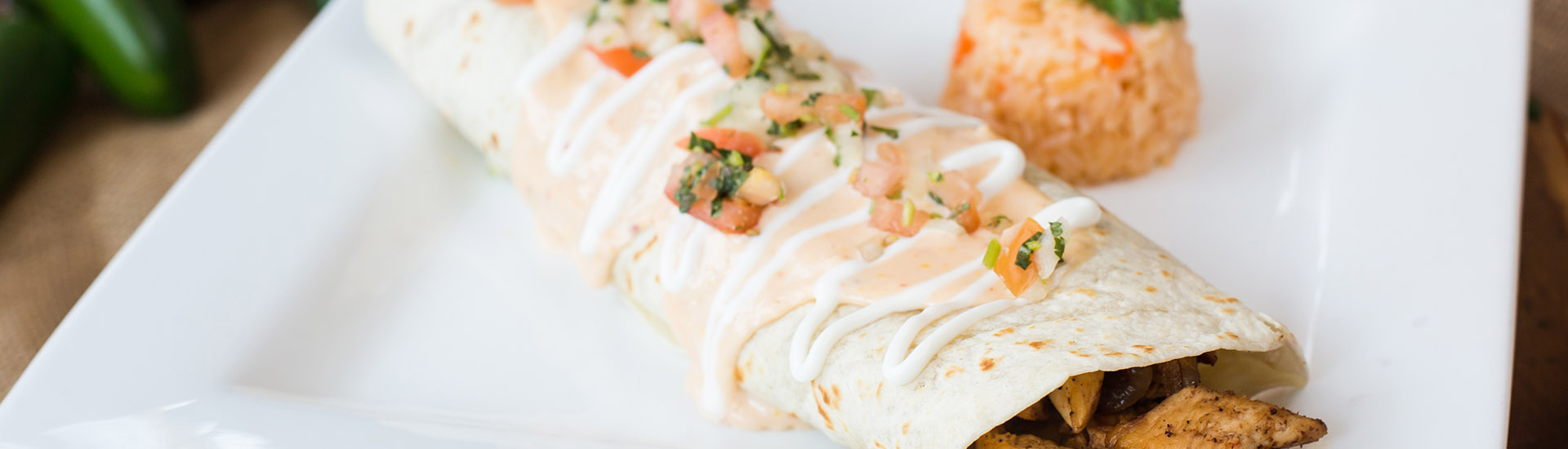 One 8 inch burrito filled with shredded chicken or beef, topped with a burrito sauce, lettuce, pico de gallo and sour cream. Served with rice and beans.